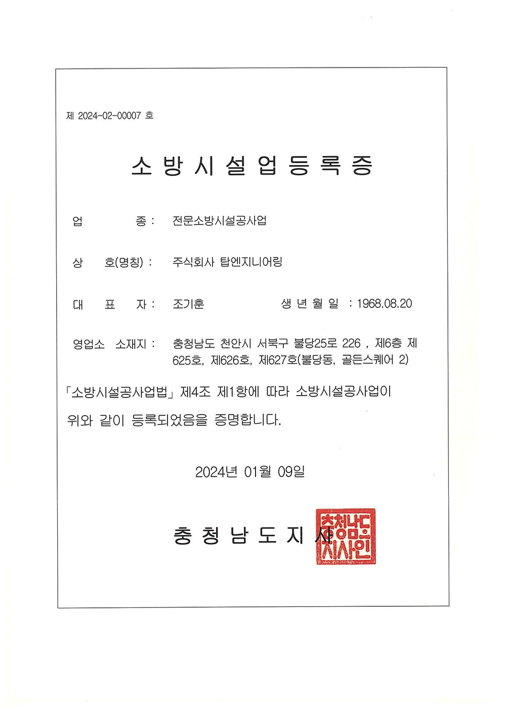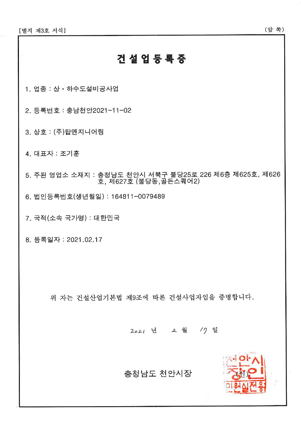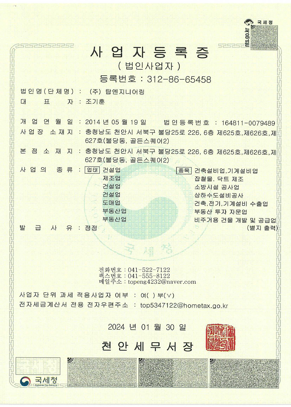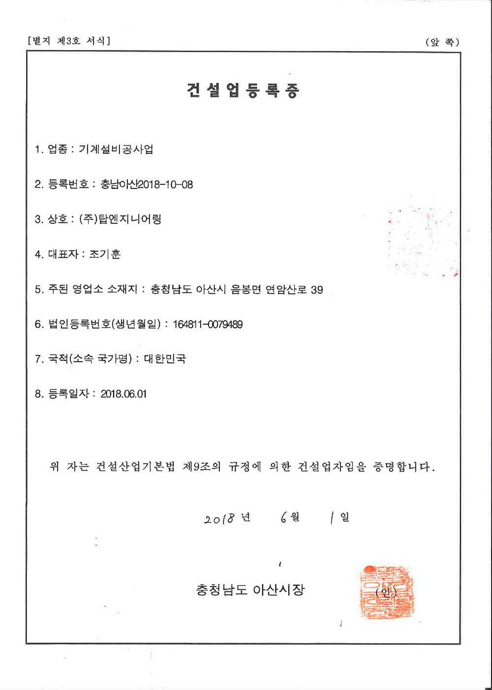 Corporate name Top Engineering Co., Ltd. Representative name Jo, Ki-Hoon Head Office Address 226, Buldang 25-ro, Seobuk-gu, Cheonan-si, Chungcheongnam-do, Republic of Korea Room 625 6F(Golden Square 2) Factory Address 214-3, Wolsan-ro, Eumbong-myeon, Asan-si, Chungcheongnam-do, Republic of Korea Business registration number 312-86-65458