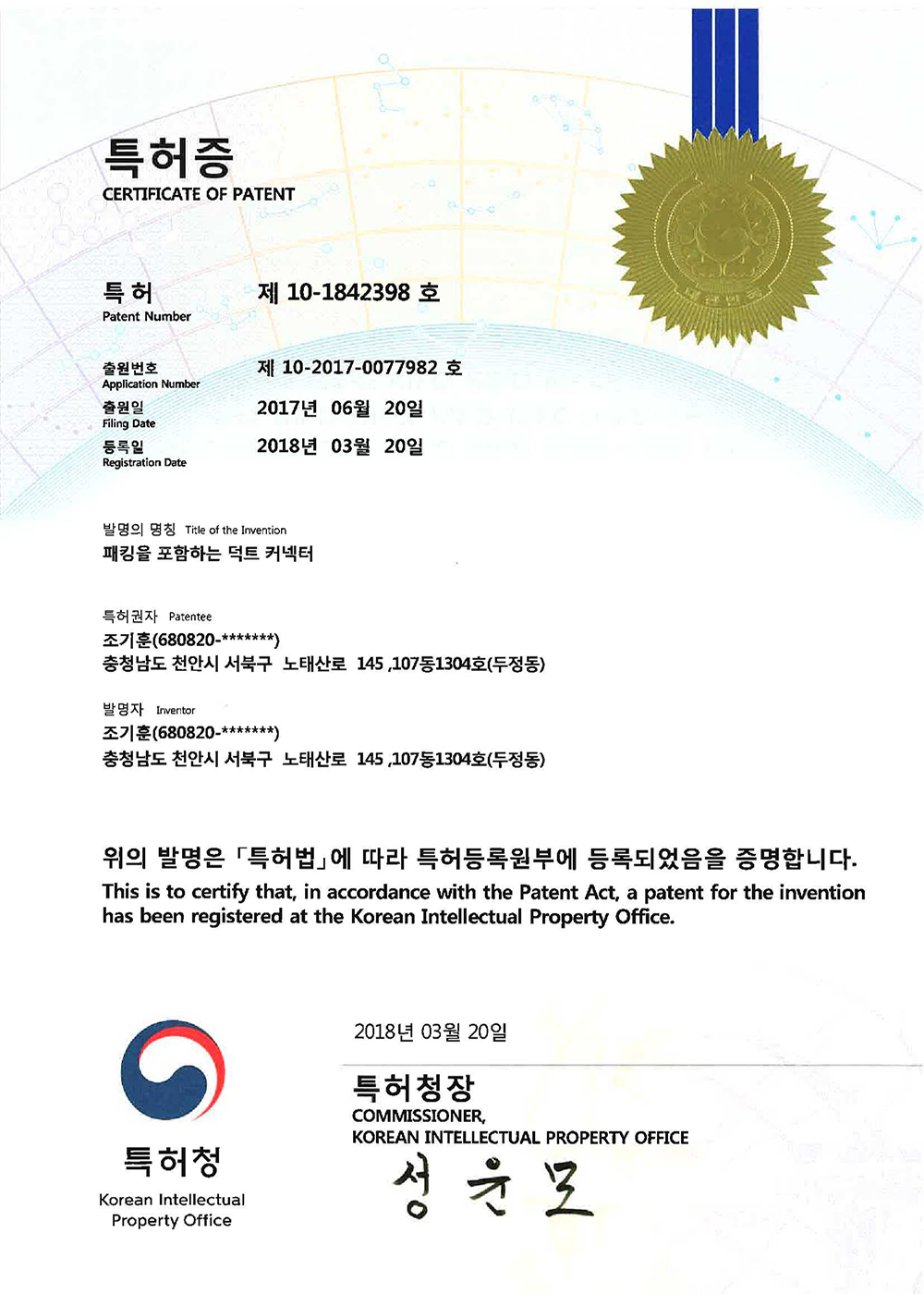 • Patent Registration Certificate(패킹을포함하는덕트커넥터)